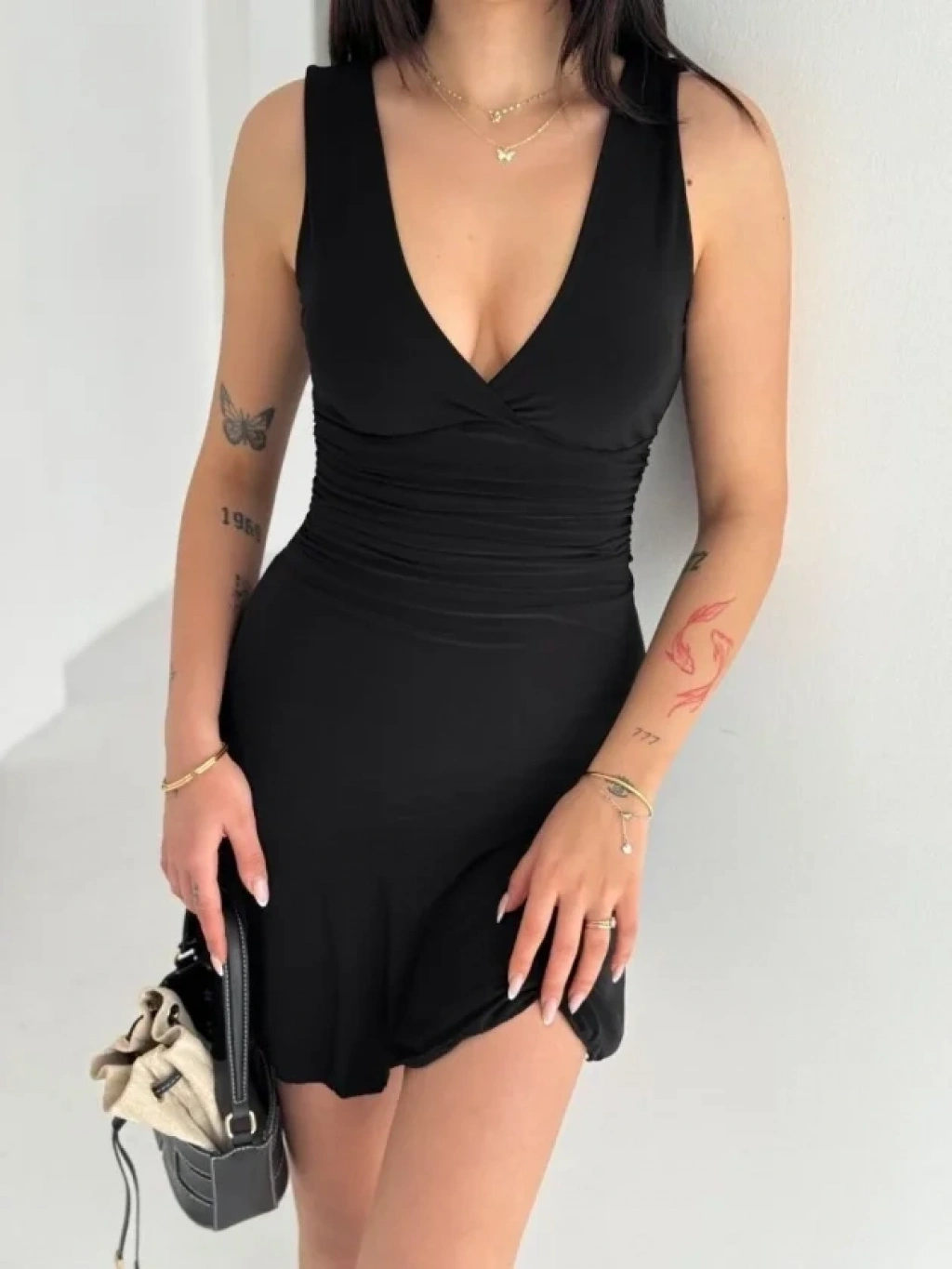 Derin V Yaka Sırt Dekolteli Mini Elbise Drapeli Şık Kolsuz - Siyah