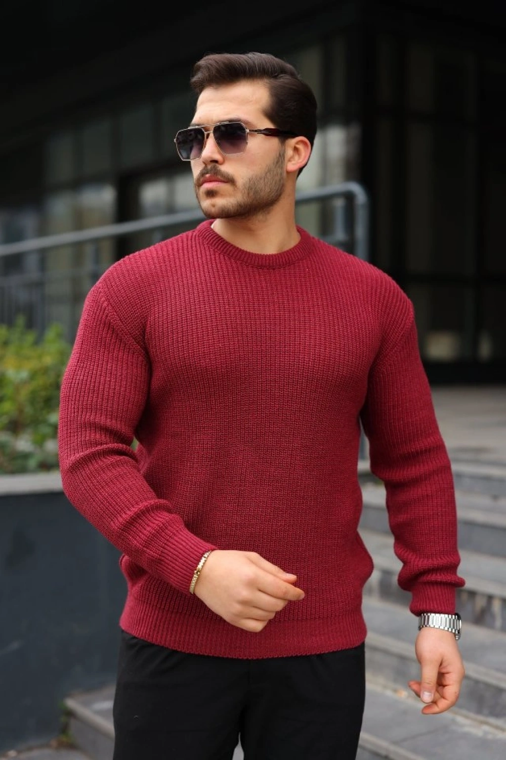 Erkek Bisiklet Yuvarlak Yaka Triko Kazak Pamuklu Kalın Fitilli Dokuma, Regular Fit Uzun Kollu Kışlık odel iyah