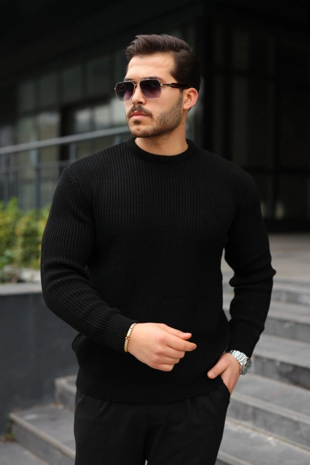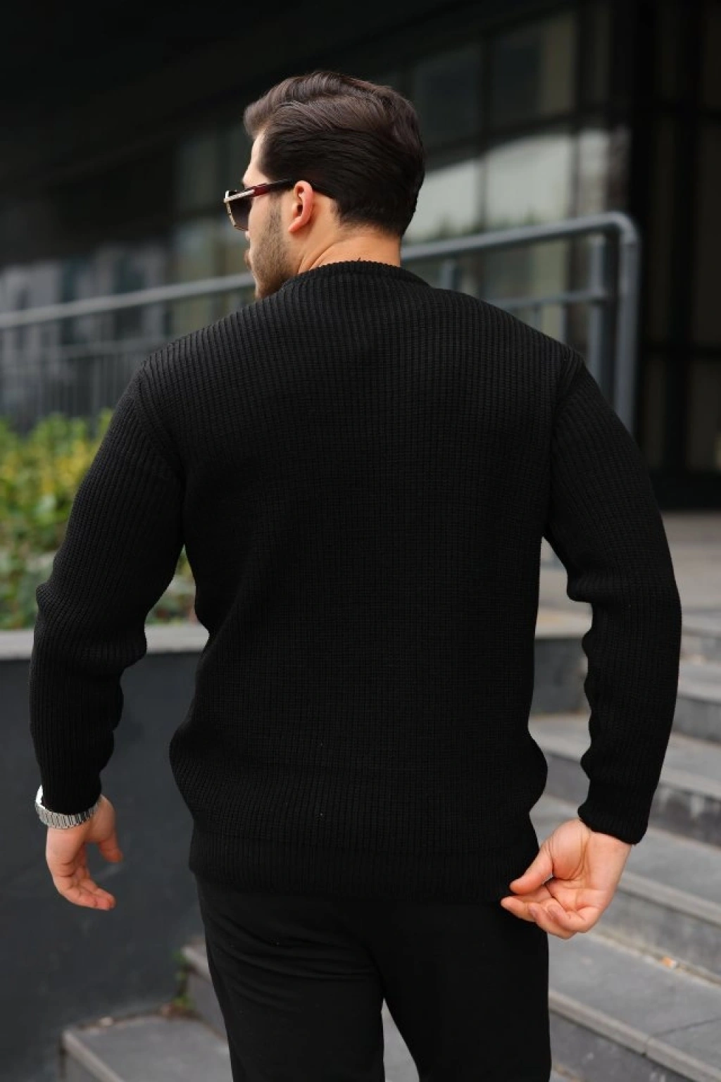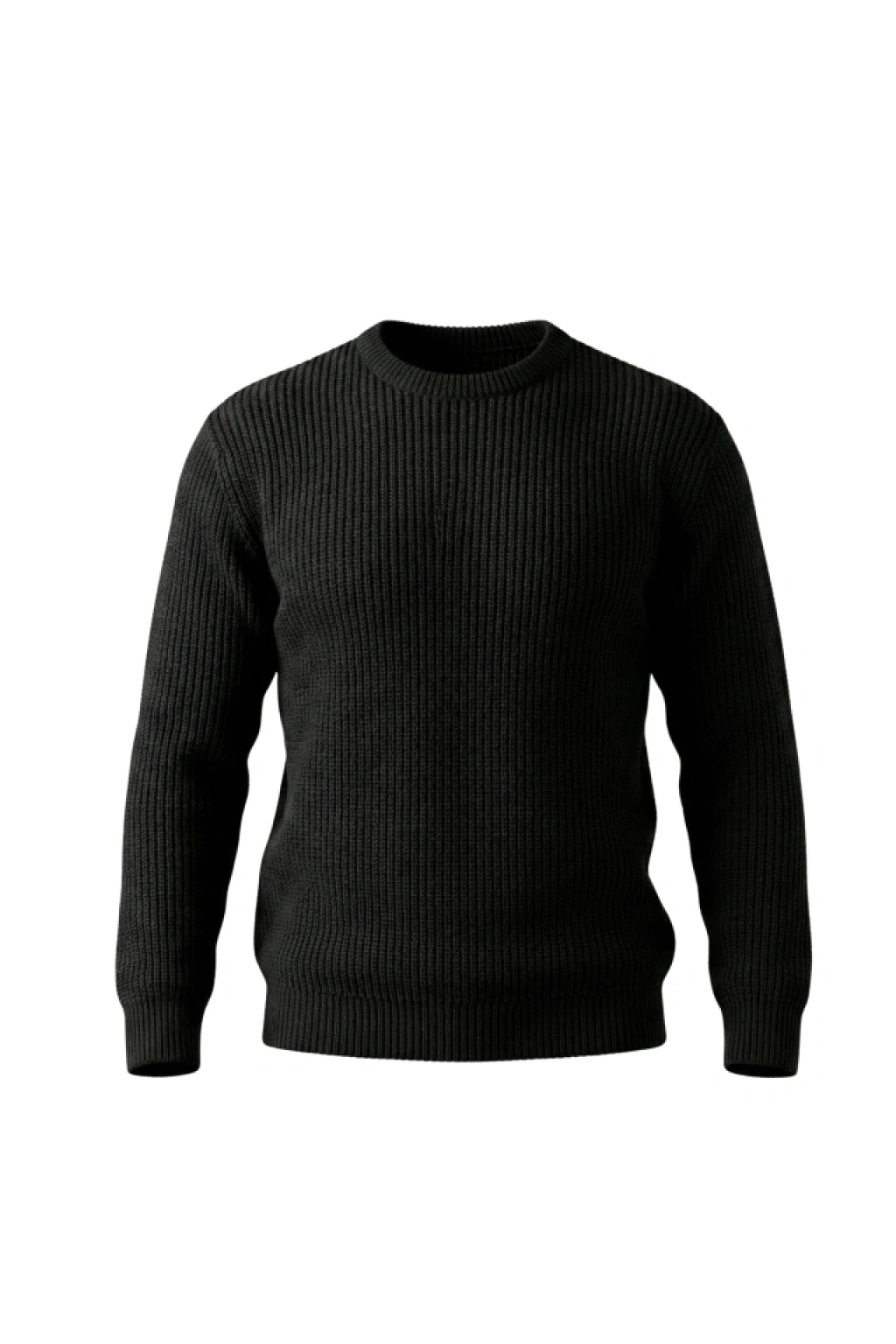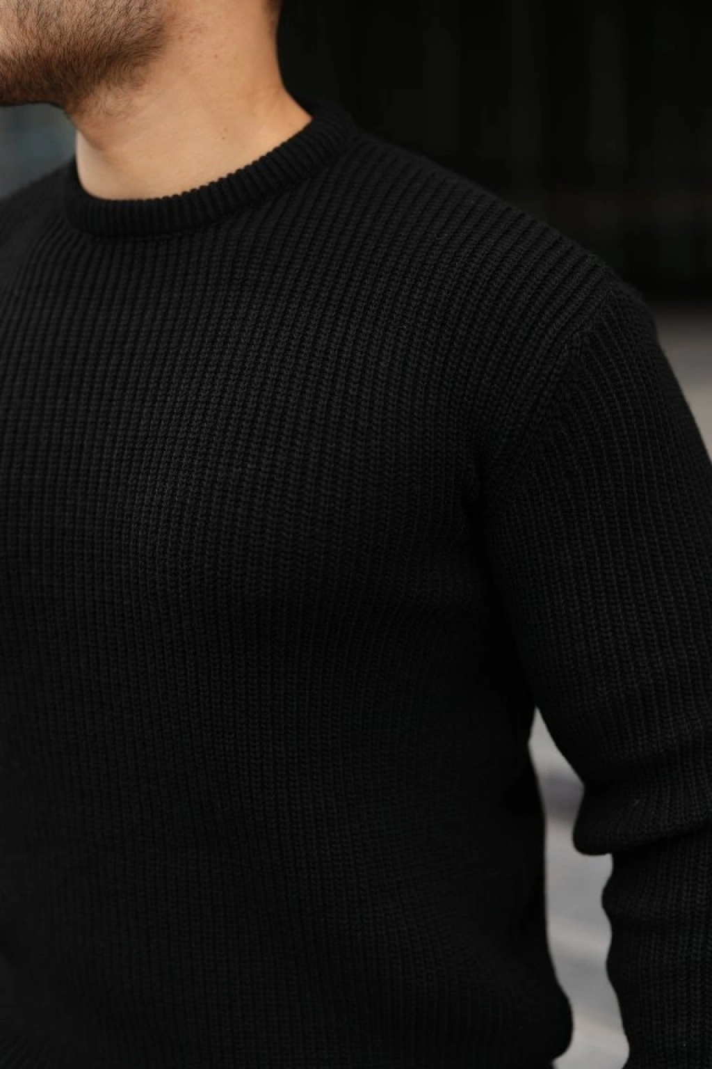 Erkek Bisiklet Yuvarlak Yaka Triko Kazak Pamuklu Kalın Fitilli Dokuma, Regular Fit Uzun Kollu Kışlık odel iyah