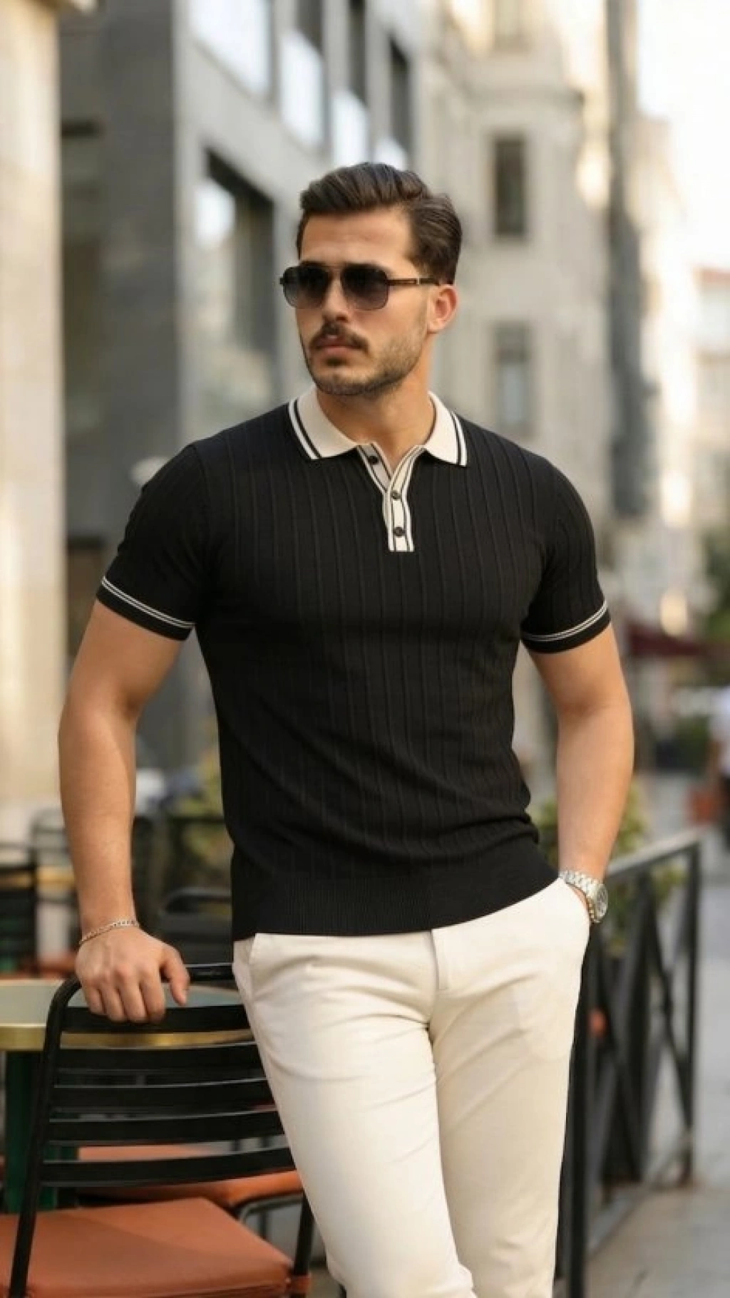 Erkek Triko Polo Yaka Fermuarlı Çizgili Tişört Thirt Yazlık Şık iyah