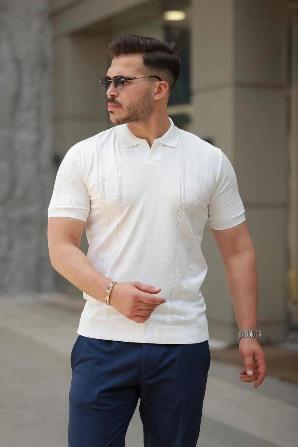 Erkek Triko Polo Yaka Fermuarlı Çizgili Tişört Thirt Yazlık Şık Beyaz