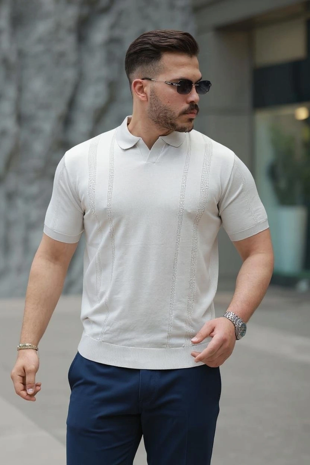 Erkek Triko Polo Yaka Fermuarlı Çizgili Tişört Thirt Yazlık Şık Beyaz