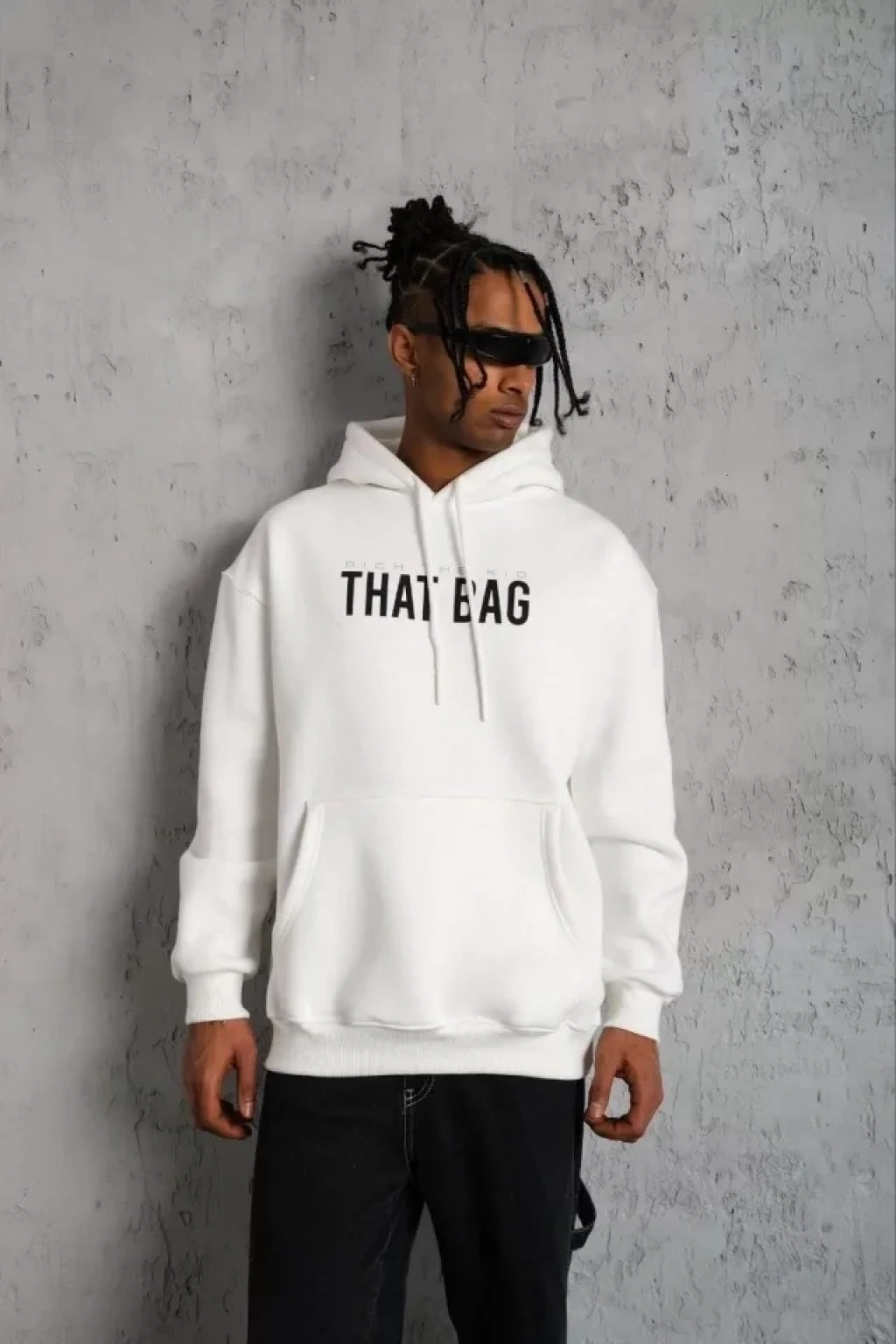 Oversize Üç İplik Şardonlu Kapüşonlu weatshirt – Beyaz “Other ives” Ön Ve Arka Baskılı, Kanguru Cepli, Ribanalı Rahat Kışlık odel Beyaz
