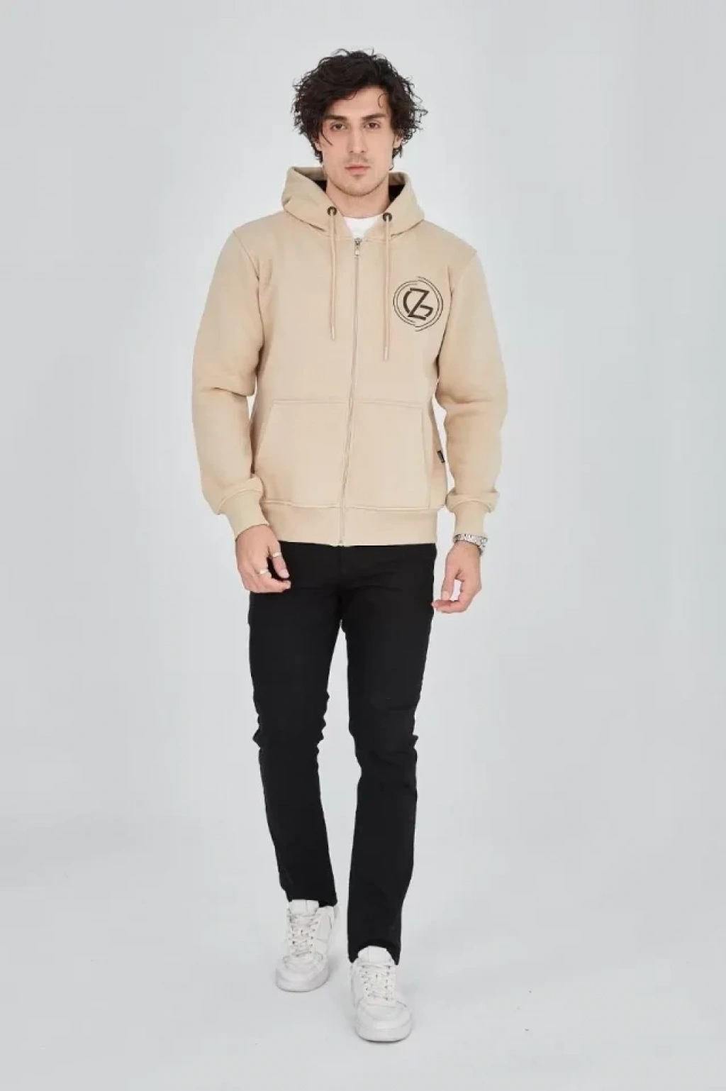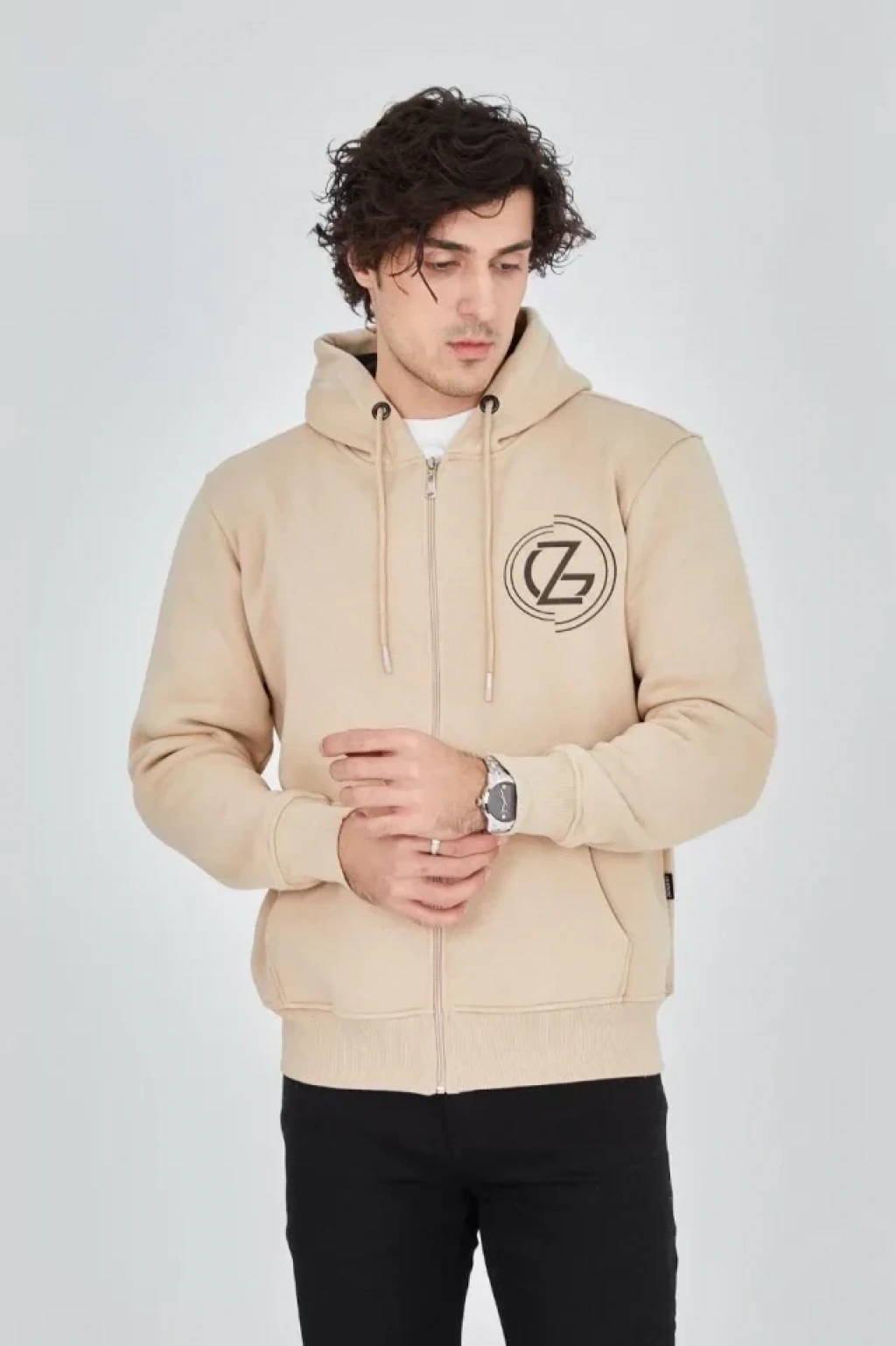 Erkek Kapüşonlu Baskılı Fermuarlı Hırka Bej