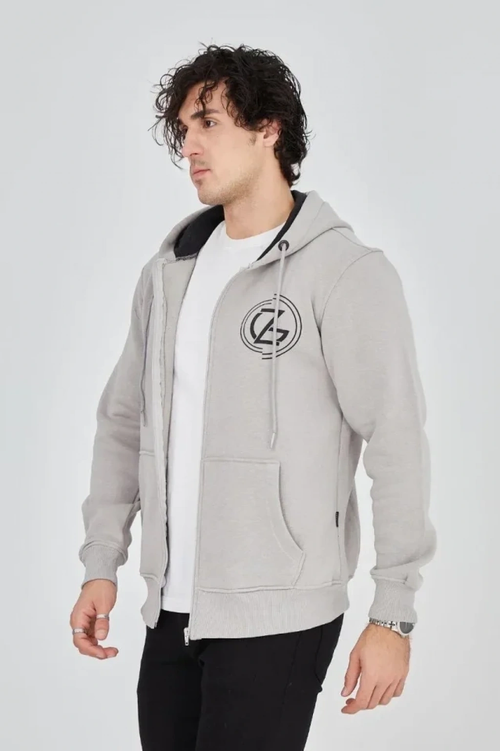 Erkek Kapüşonlu Baskılı Fermuarlı Hırka - Boyalı Gri