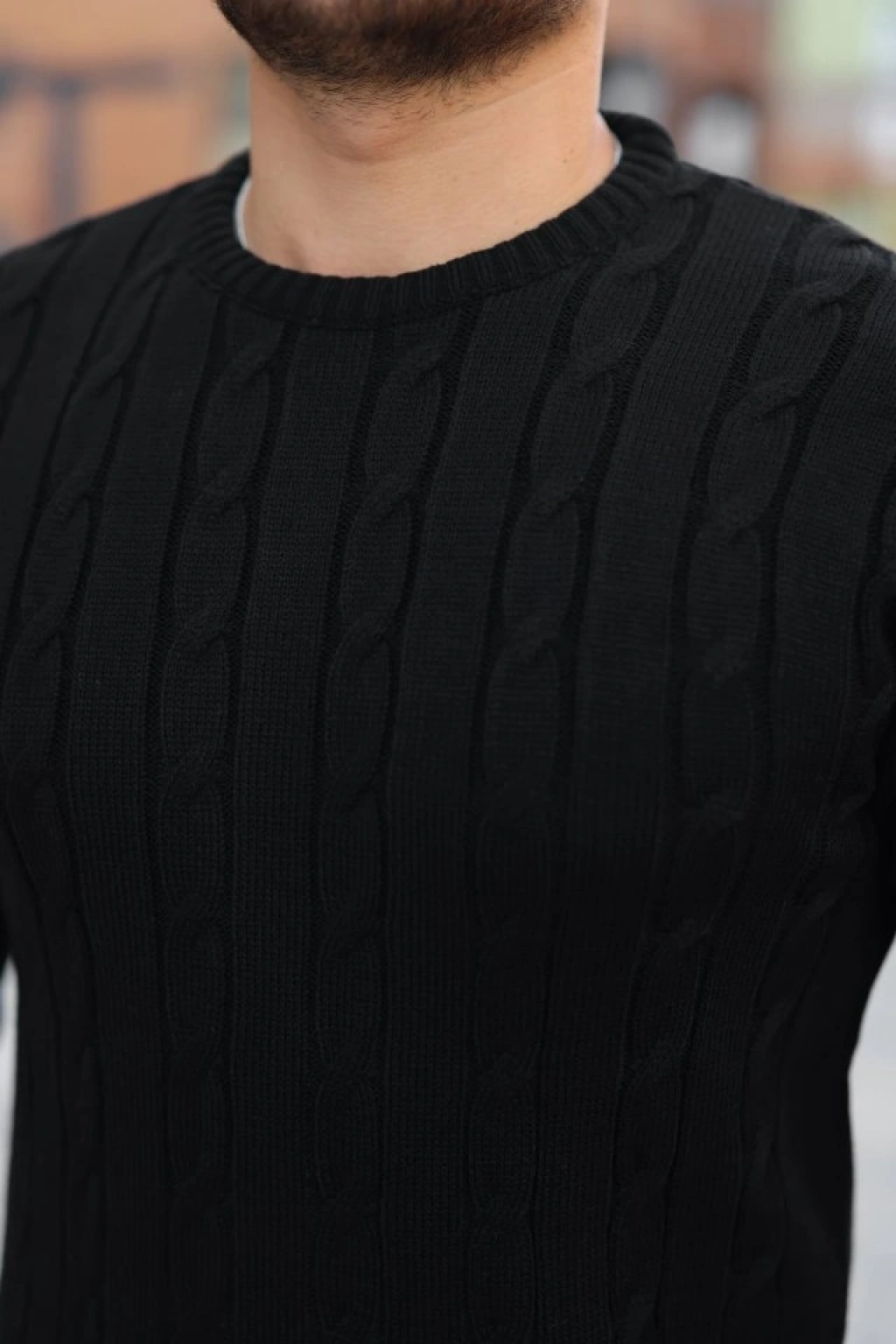 Erkek Bisiklet Yuvarlak Yaka Triko Kazak Pamuklu Kalın Fitilli Dokuma, Regular Fit Uzun Kollu Kışlık odel iyah