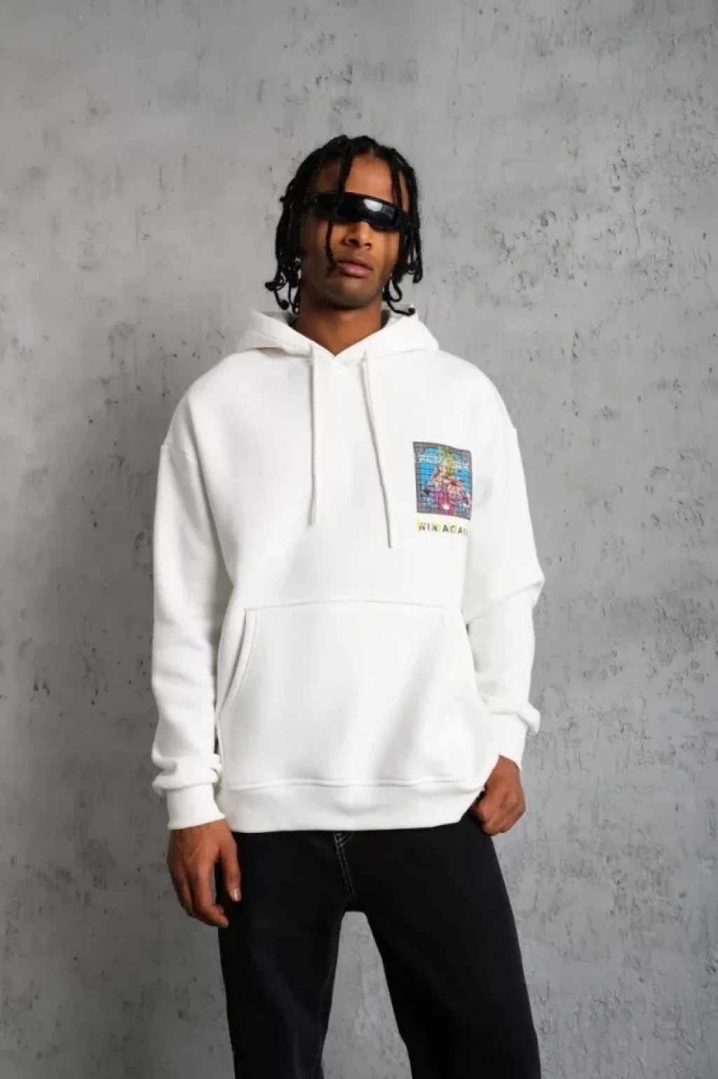 Erkek Baskılı Kapüşonlu Ve Kordon İpli weat Beyaz