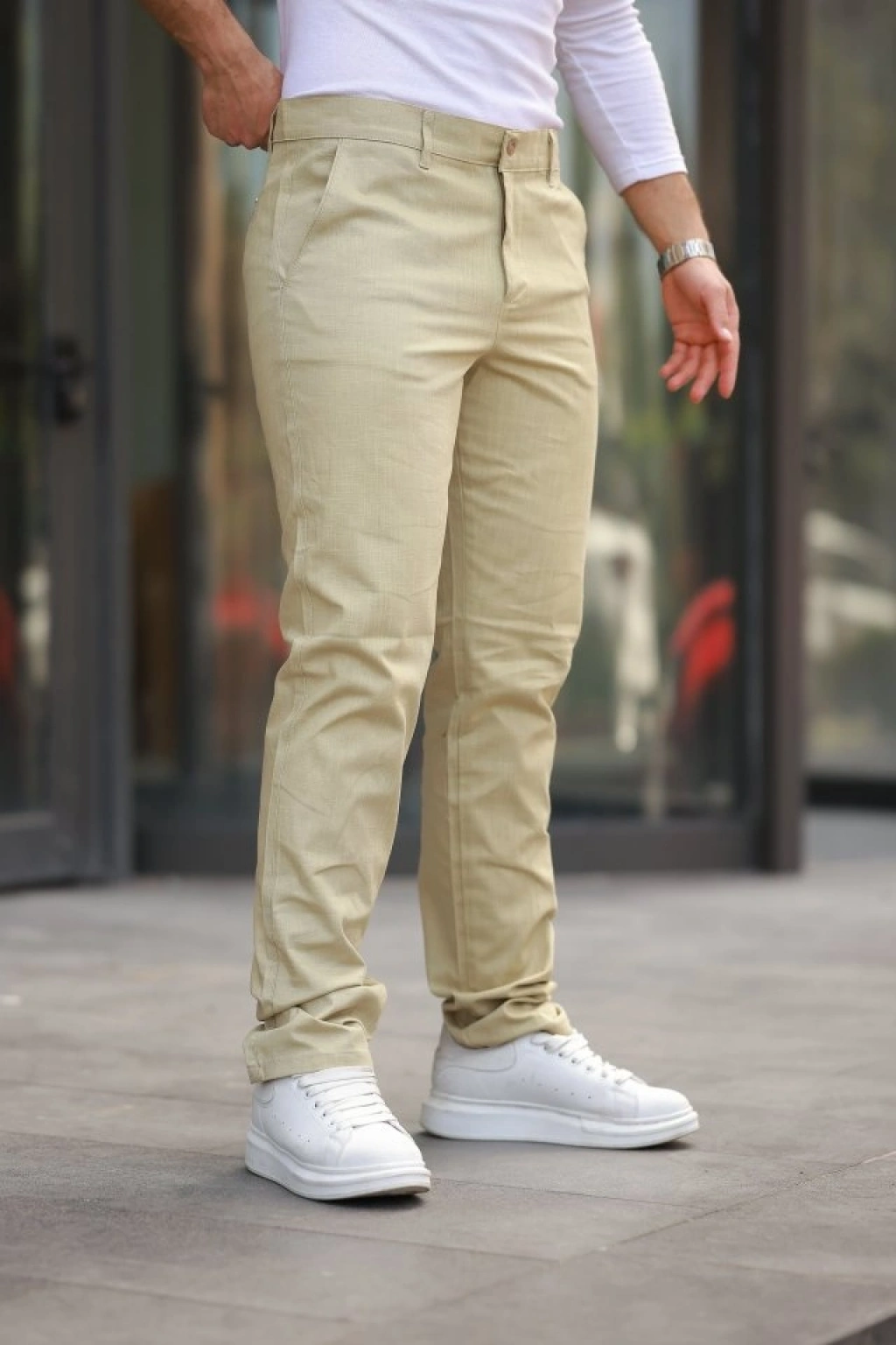 Erkek Diagonel ikro Dokulu Duble Paça Cepli Pantolon Bağcıklı Bel, odern Kesim Krem