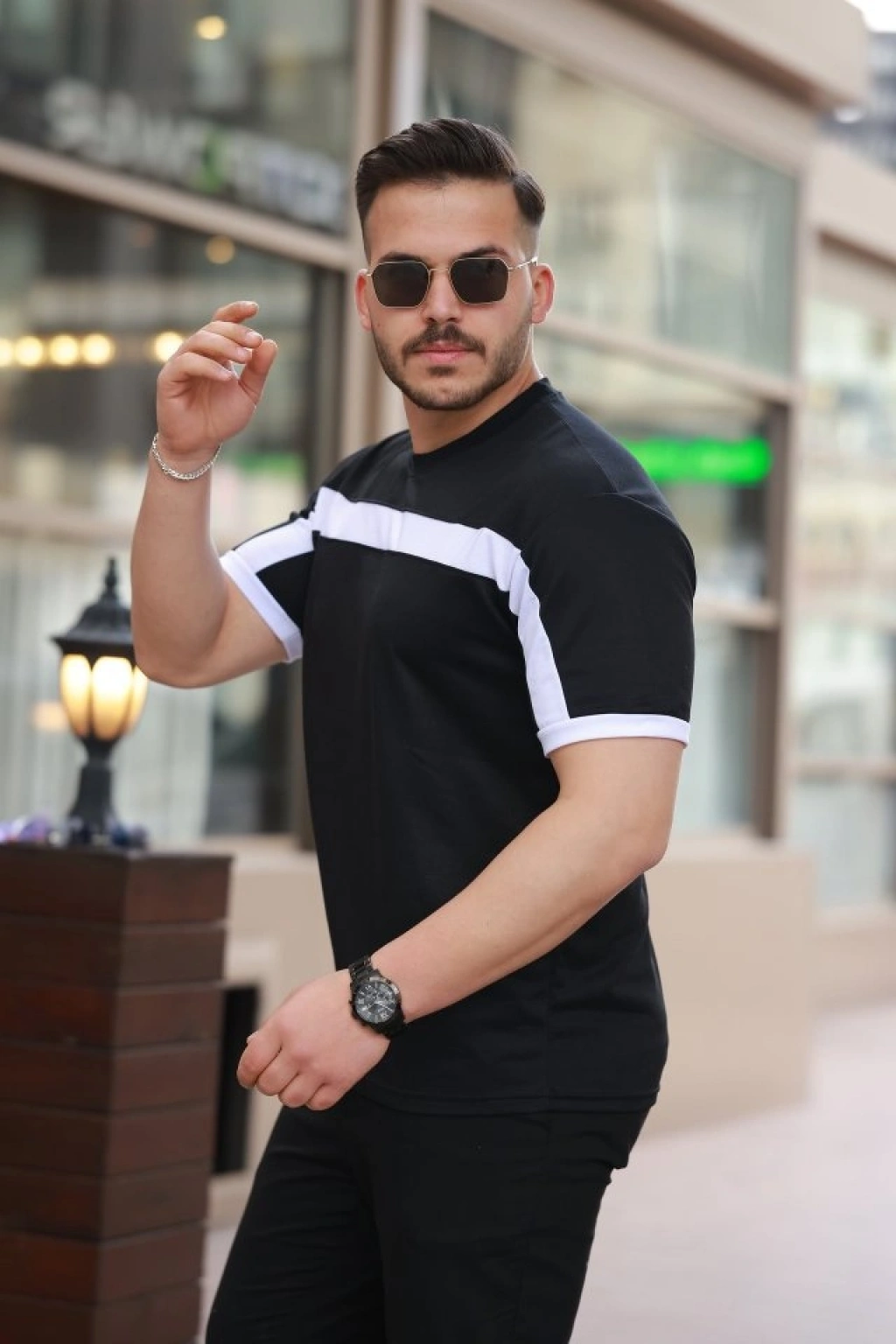 Erkek Yazlık Fitilli Triko Tişört Kısa Kol Bisiklet Yaka Thirt iyah