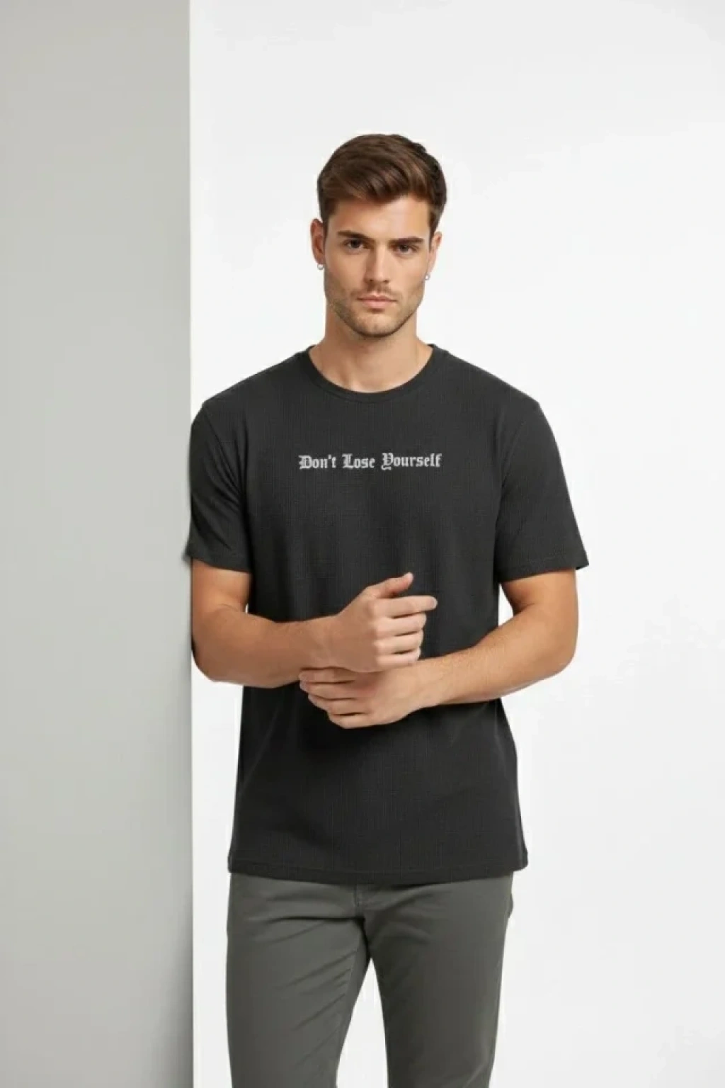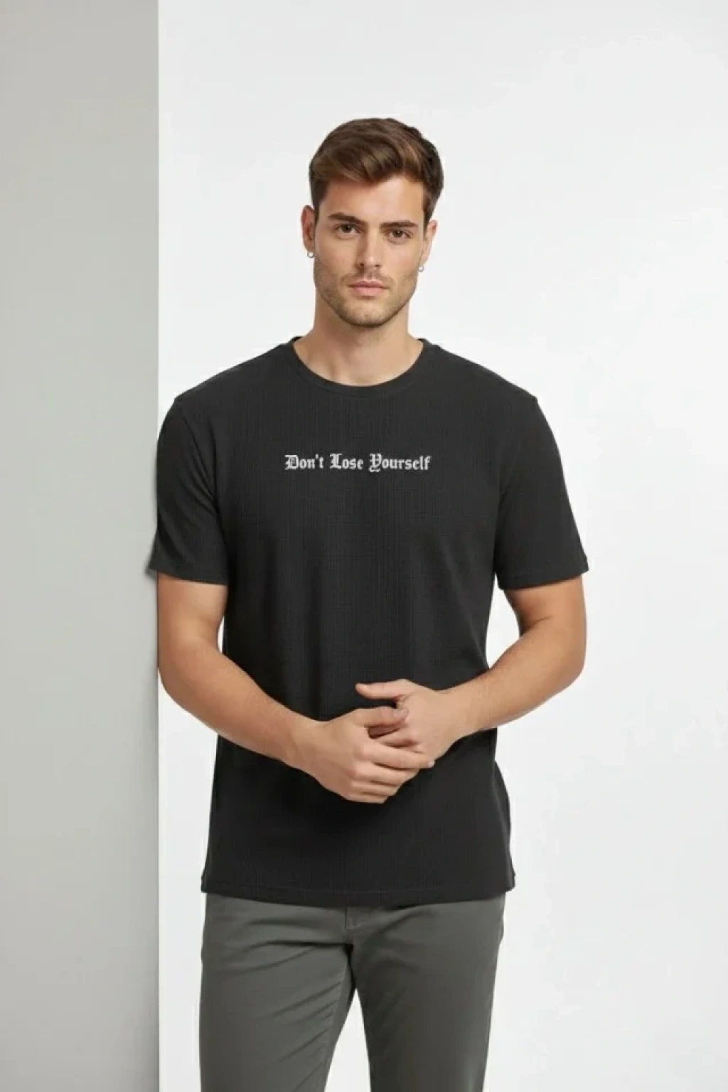 Erkek Wafıl Kumaş Tişört Regular Kalıp Bisiklet Yaka Baskılı Günlük Basic T-Shirt - Siyah
