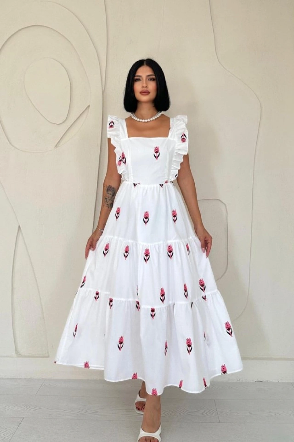 Fuşya Sıfır Kol Fırfırlı Elbise