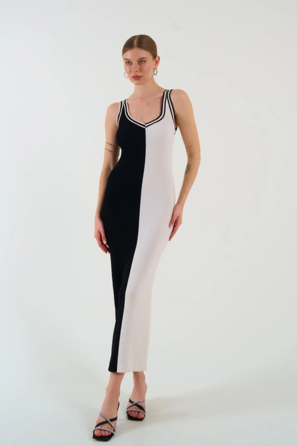 İki Renki Kolsuz Elbise - Siyah-Krem