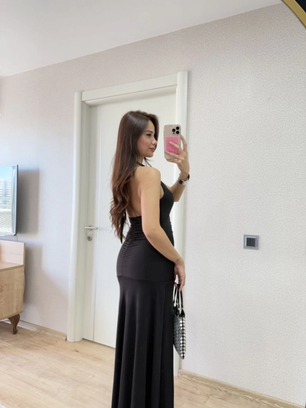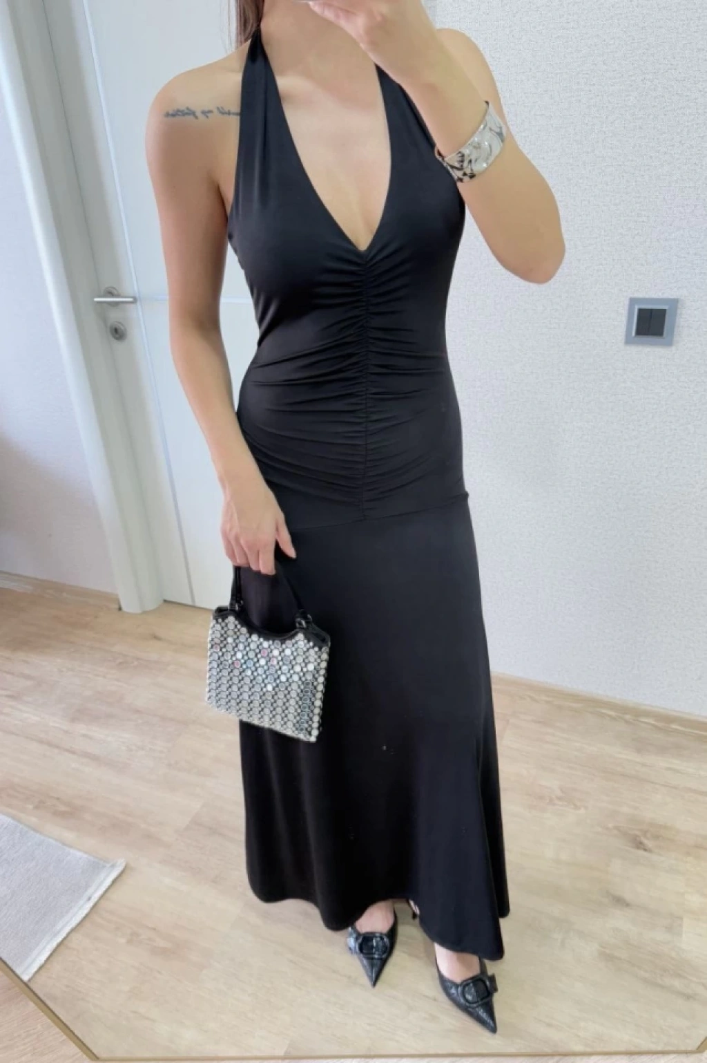 Sırt Dekolteli Uzun Kollu Elbise - Siyah