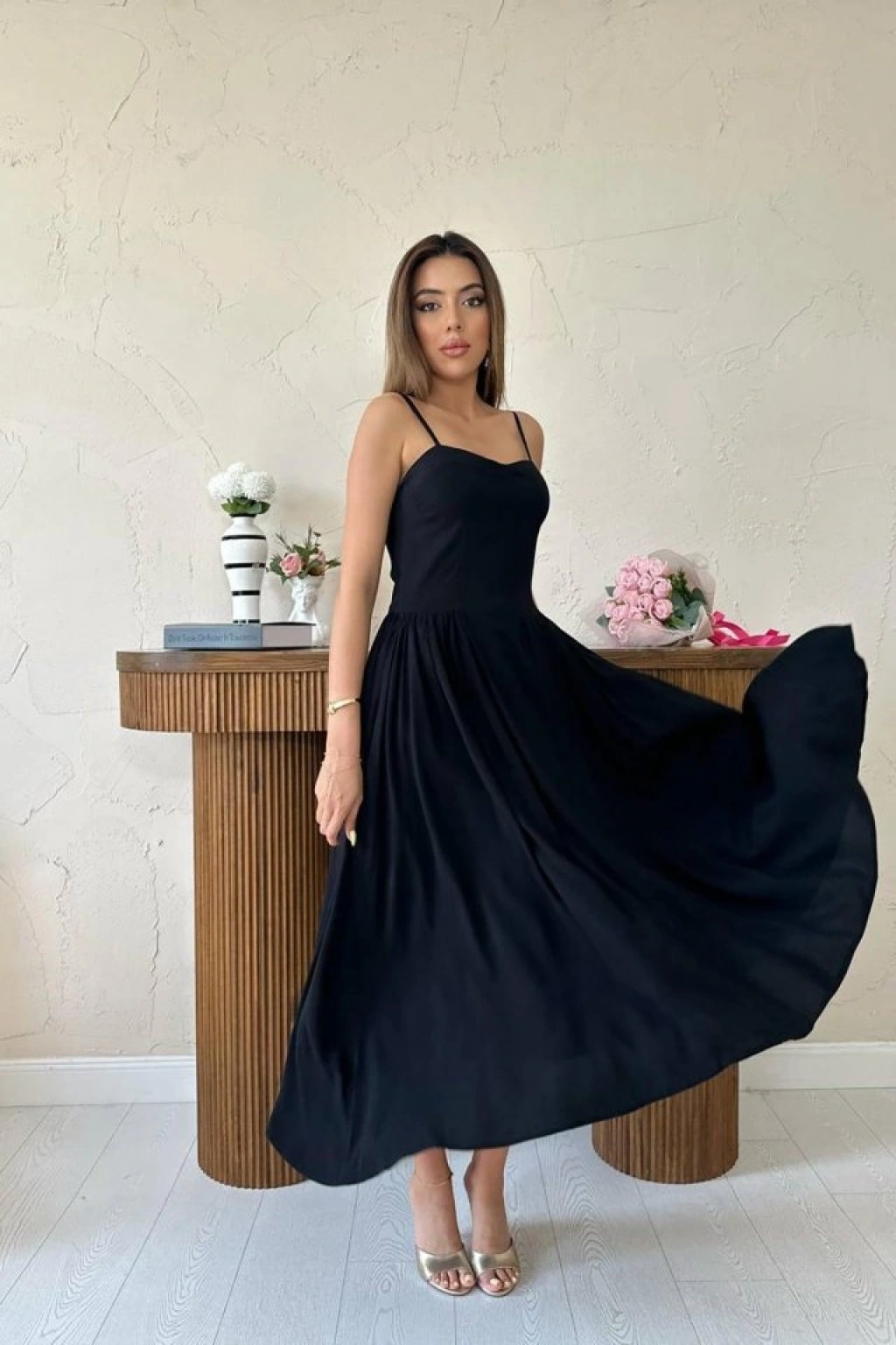 Siyah Göğüs Kuplu Uzun Büzgülü Elbise