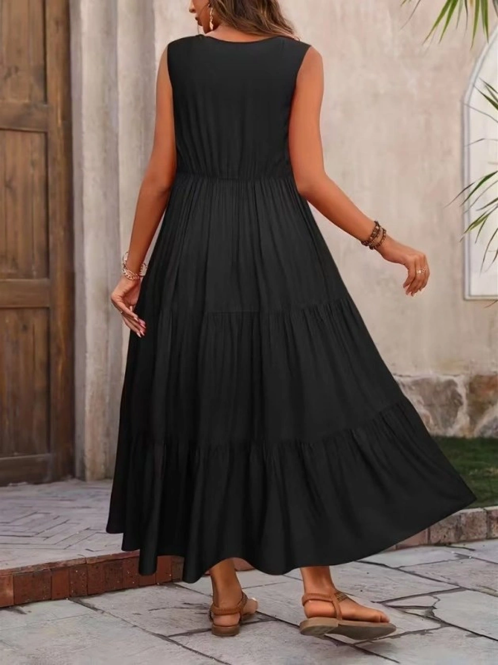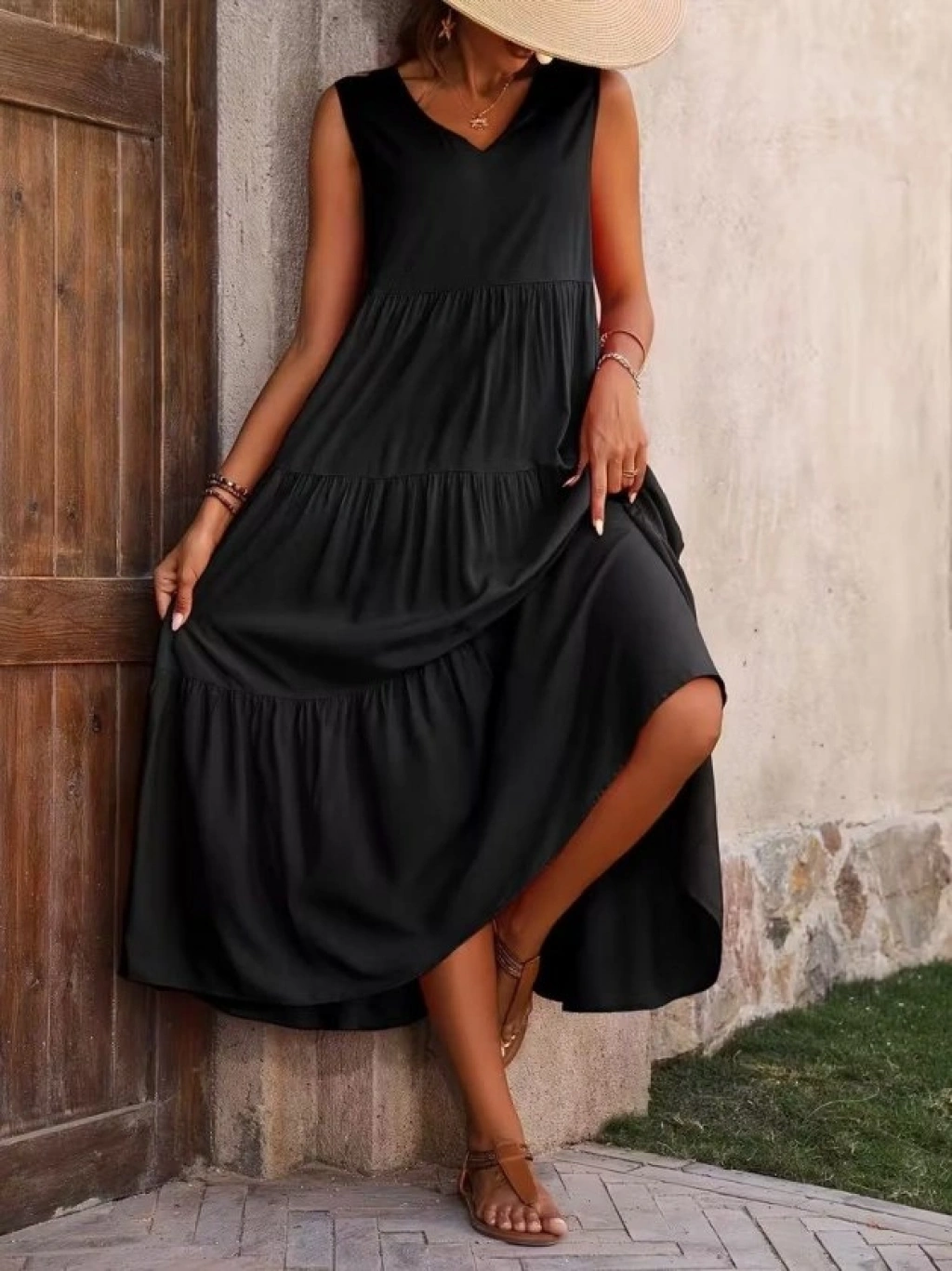 Kadın Askılı V Yakalı Uzun Dokuma Viskon Elbise