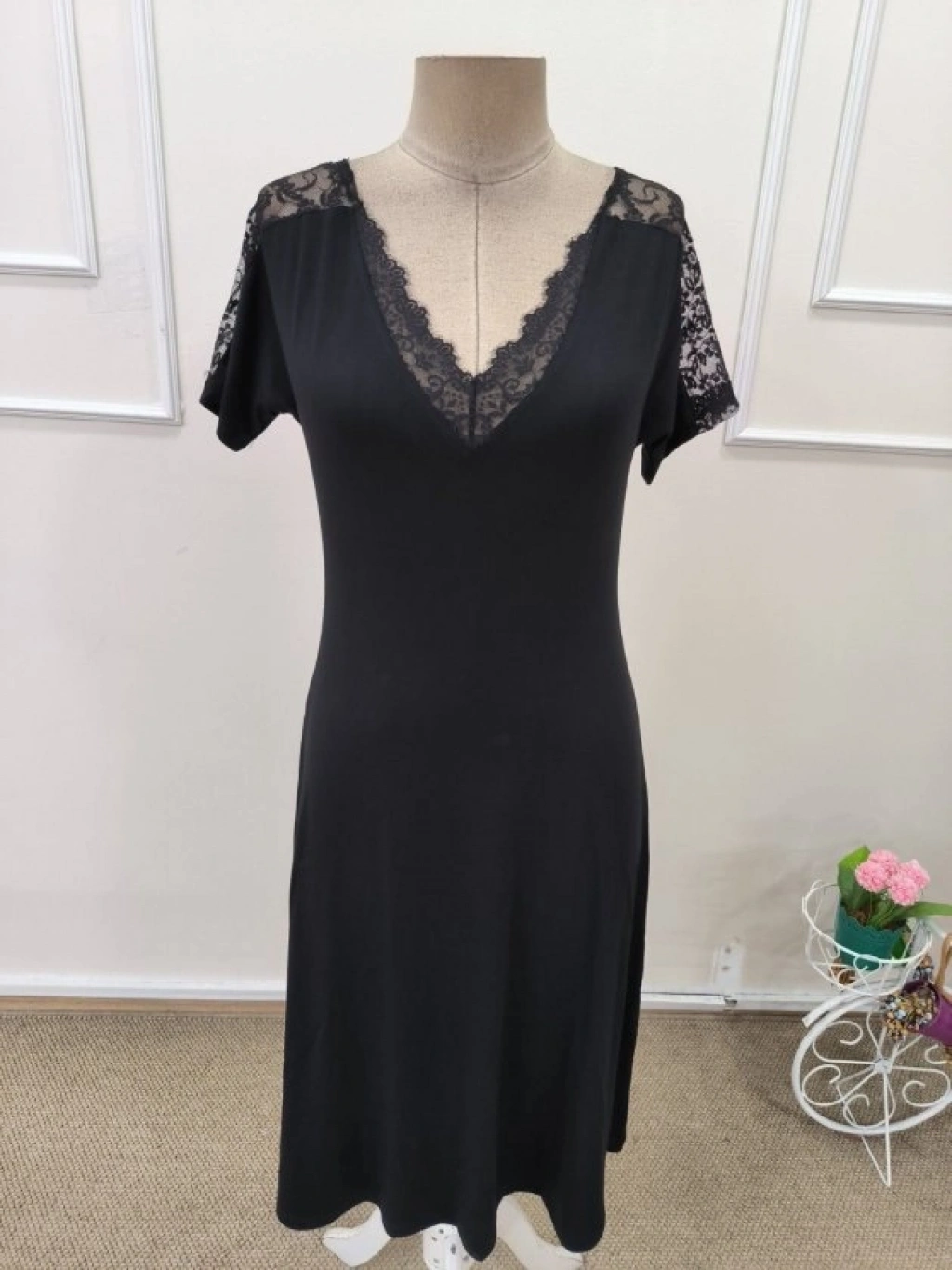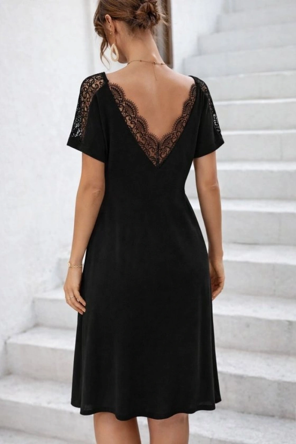 Kadın Kısa Kollu Dantel V Yakalı Midi Viskon Elbise