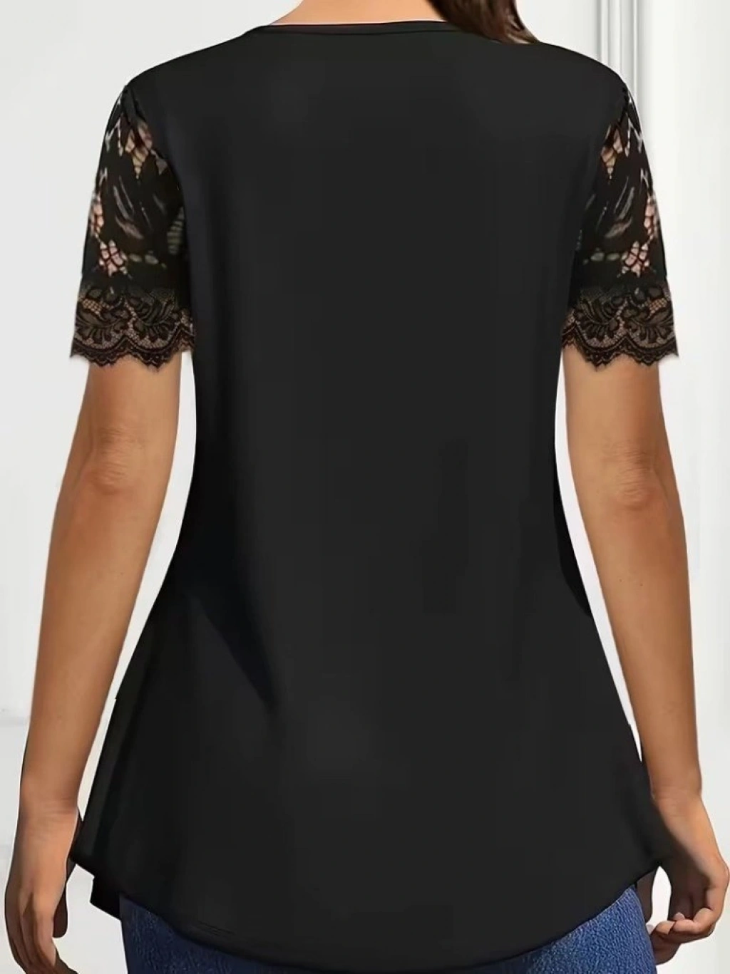 Kadın Kısa Kollu V Dantel Yakalı Düğmeli Viskon Bluz