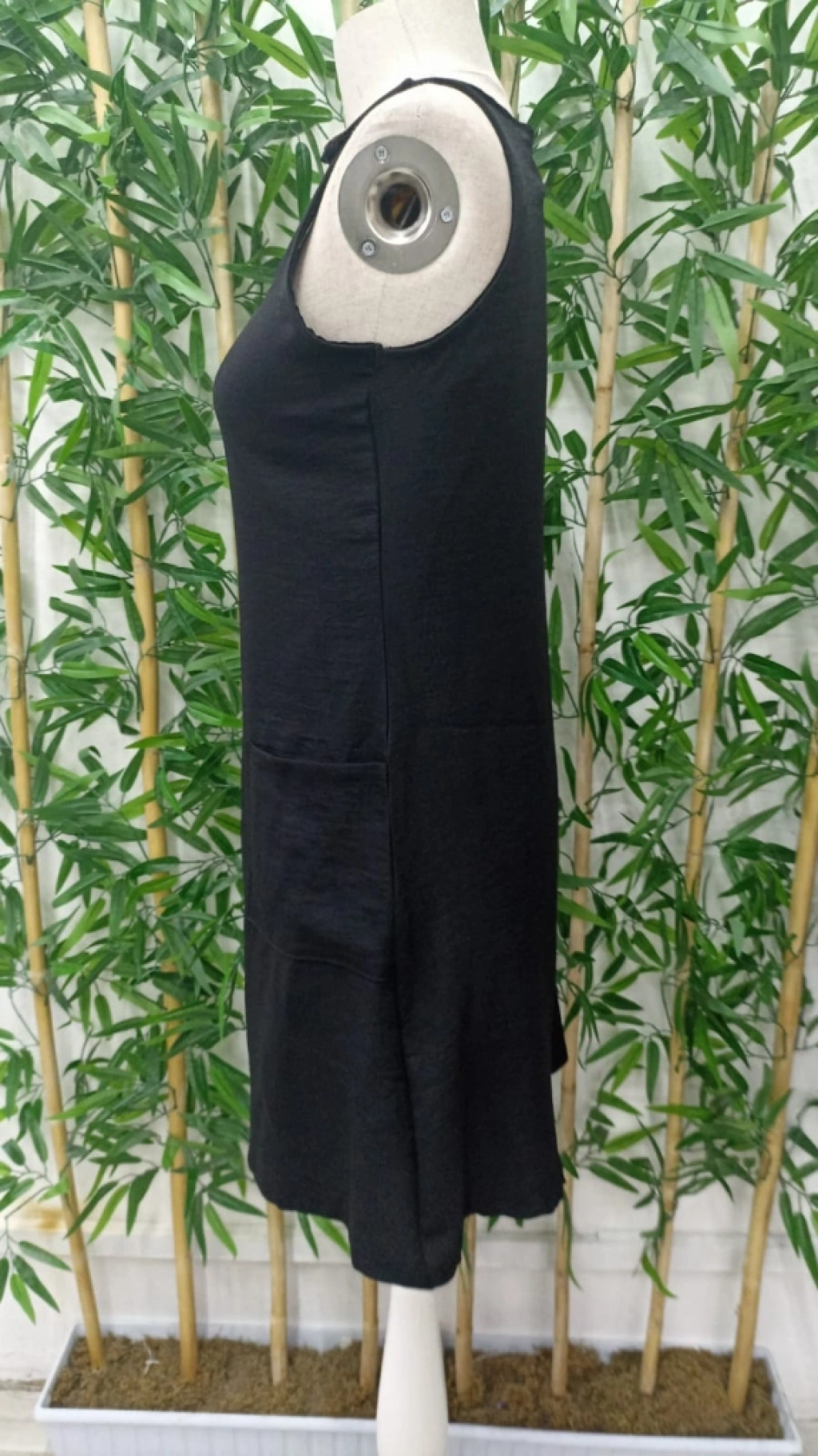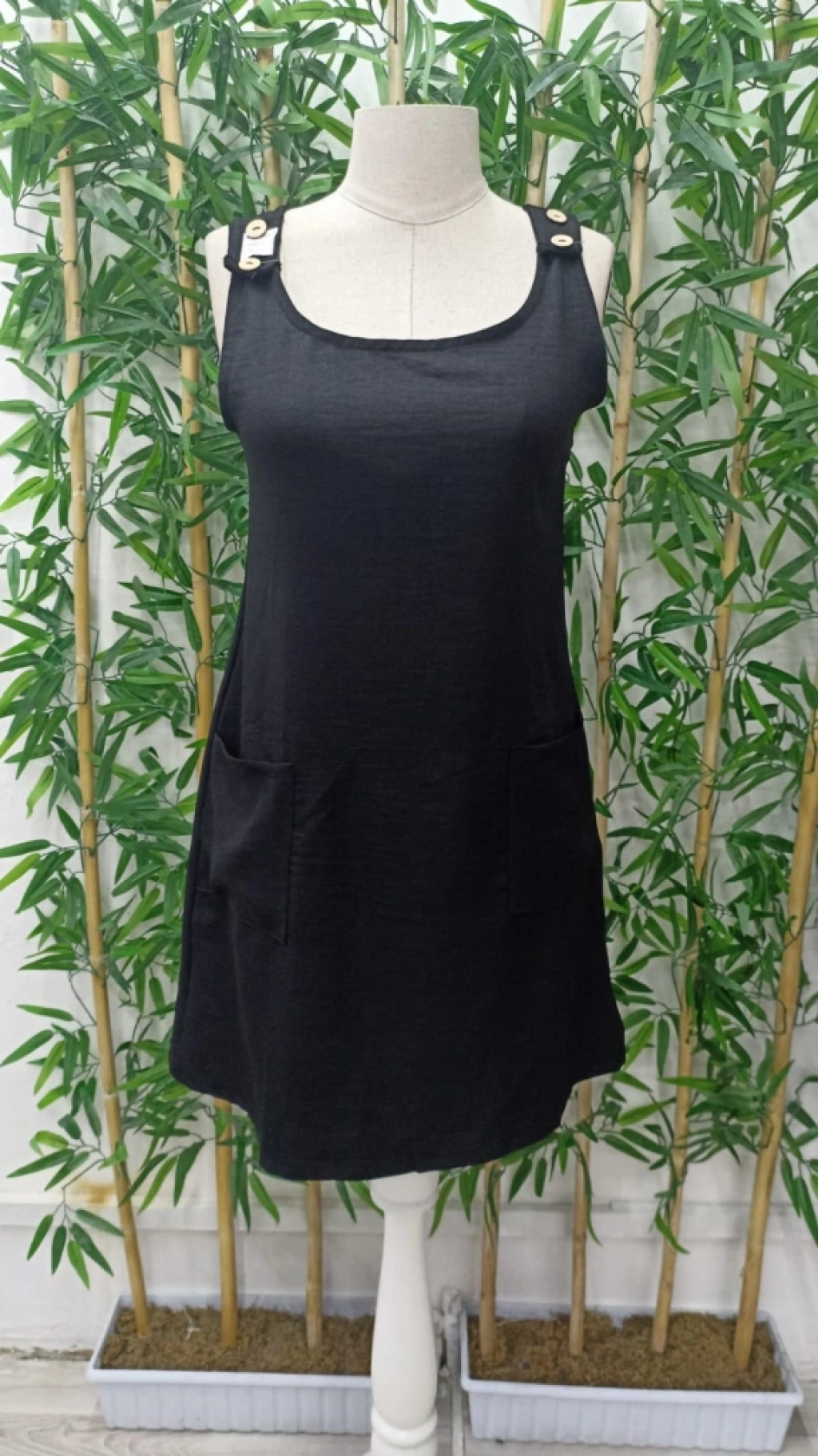 Kadın Kolsuz Kalın Askılı Düğme Detay Cepli Keten Elbise
