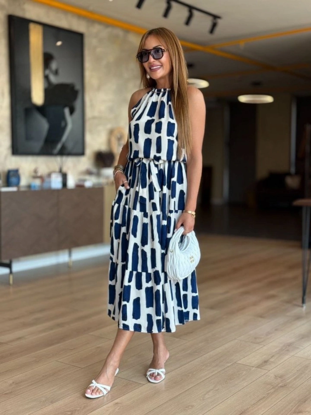 Kadın Viskon Kumaş Ip Askılı Halter Yaka Cepli Midi Boy Elbise