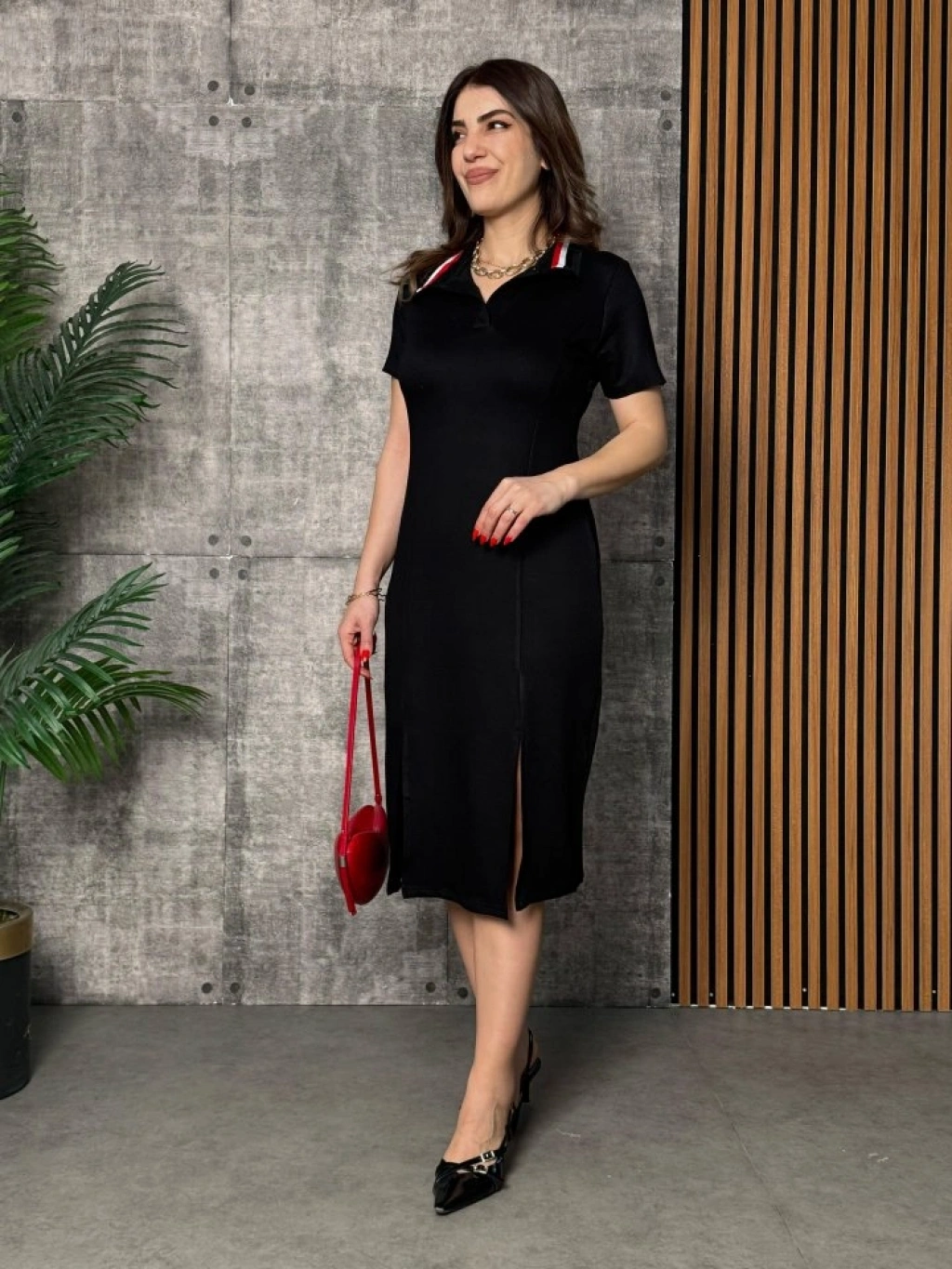 Kadın Yaka Ribanalı Çift Yırtmaçlı Elbise
