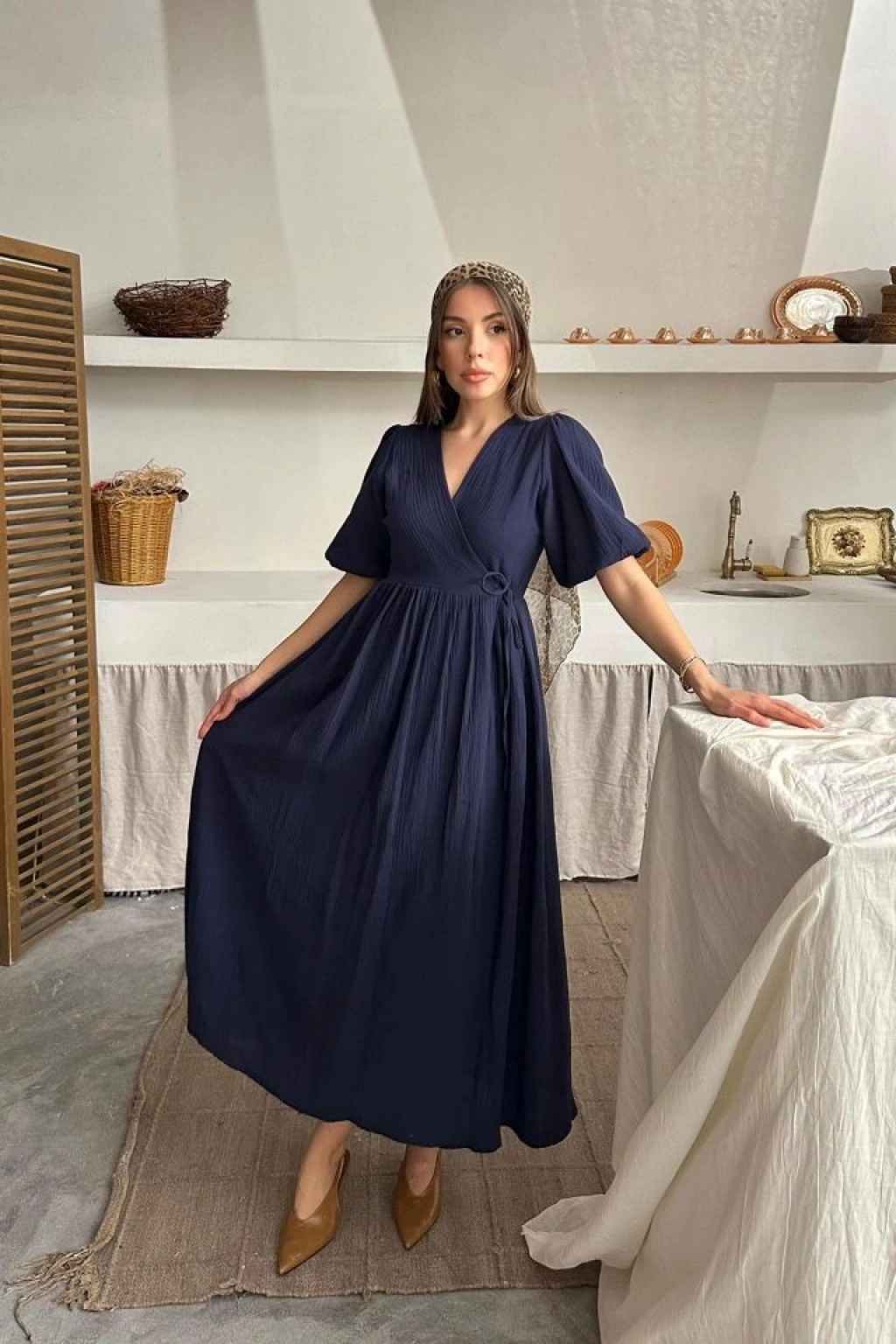 Lacivert Müslin Uzun Elbise