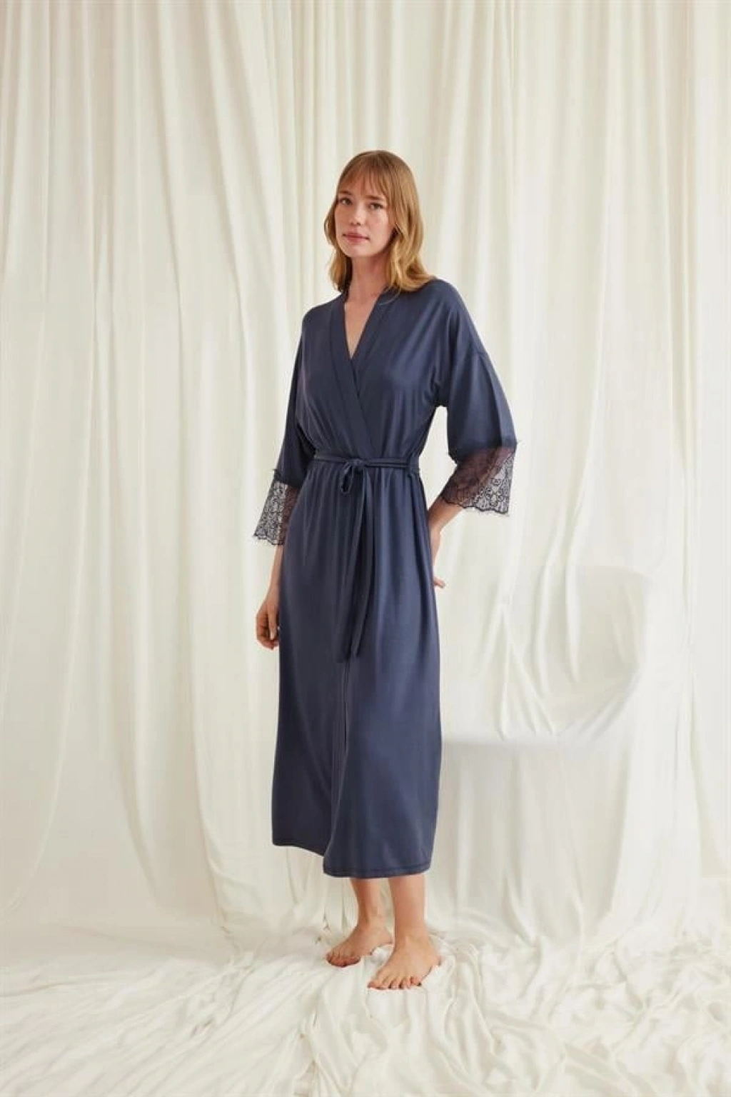 Sabahlık: Lacivert renklidir, kol ağzı dantellidir, truvakar kolludur, kuşaklıdır, örme kumaştır.