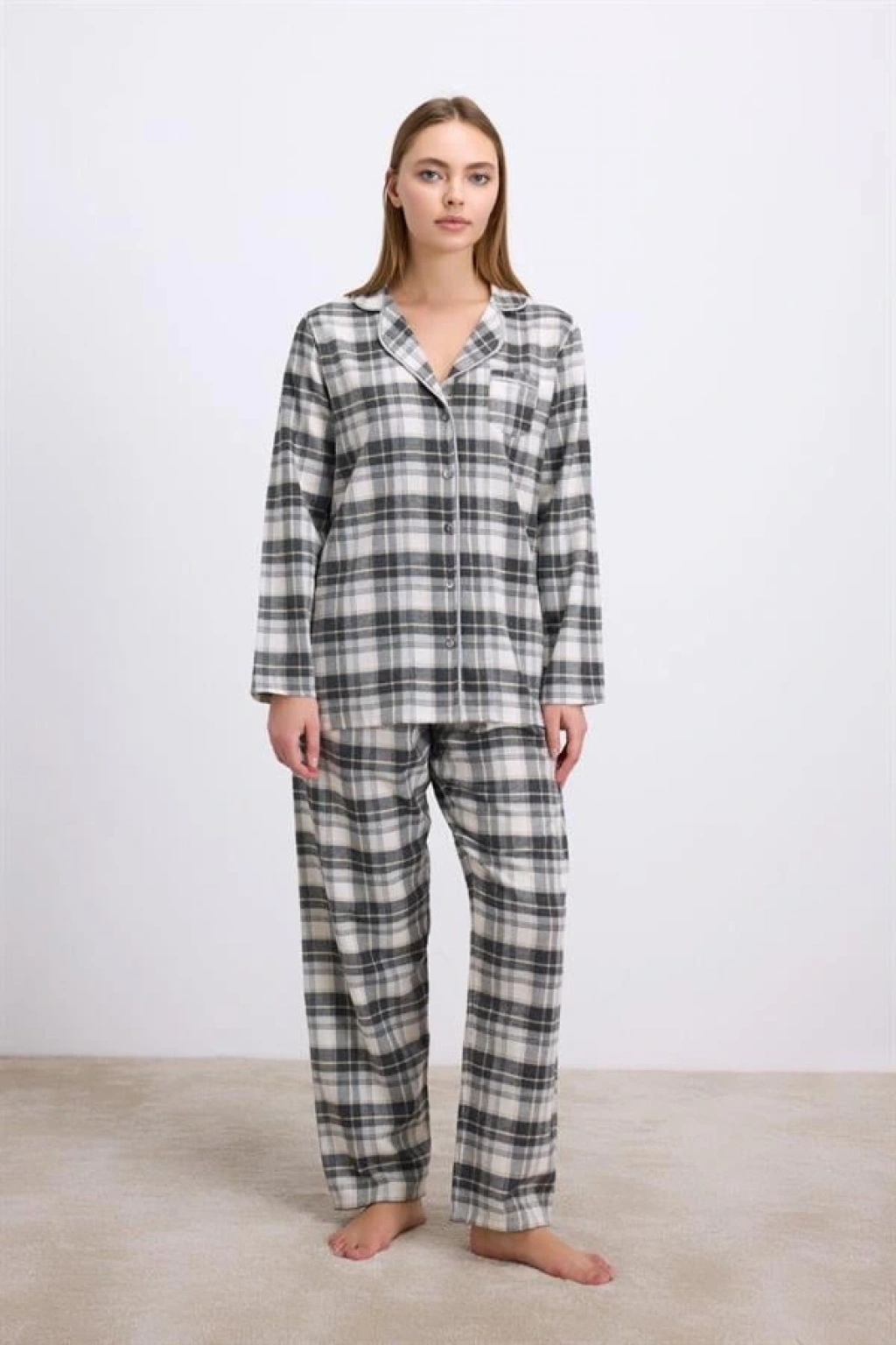 Kış gecelerinin vazgeçilmezi olmaya aday bu pijama takımı, flanel görünümlü kumaşı sayesinde sıcak tutarken yumuşacık dokusuyla maksimum rahatlık sunar. Klasik kareli desen, ev şıklığını zamansız bir tarzla buluşturur. Uzun kollu üst ve rahat kesim pantolon ile soğuk günlerde stil sahibi bir konfor sağlanır.