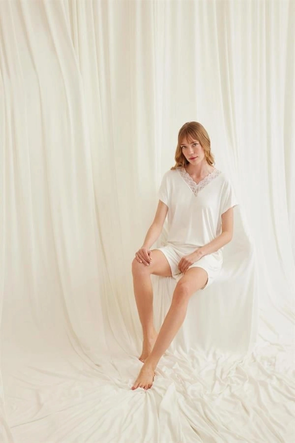 Üst: Ekru renklidir, V yakalıdır, yakası dantellidir, örme kumaştır.Alt: Ekru renklidir, ceplidir, örme kumaştır.