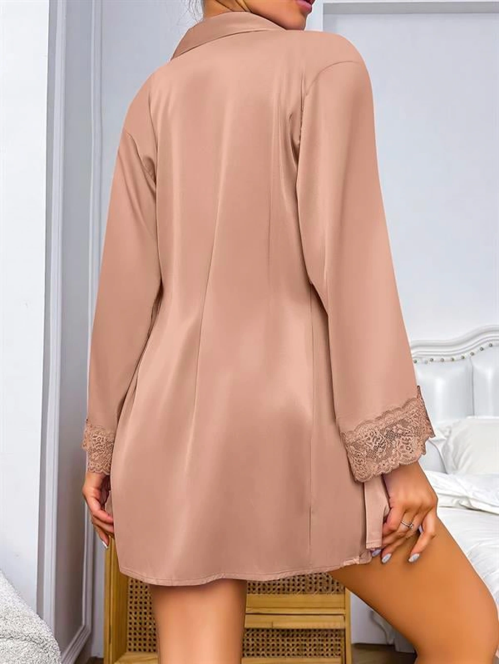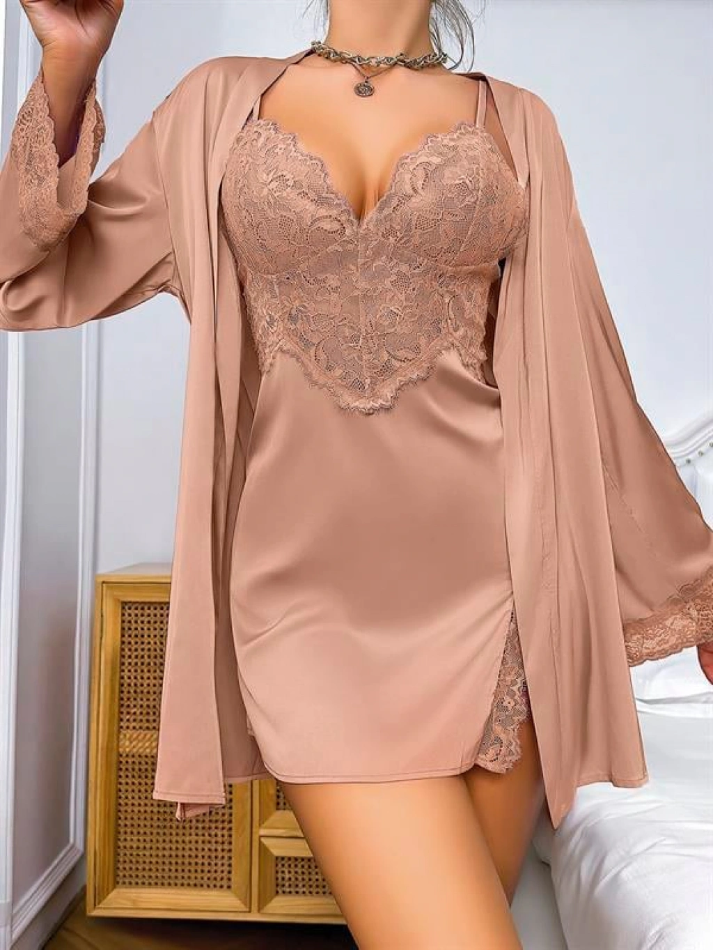 Özel Tasarım Dantel İşlemeli Şık Göğüs Dekolteli Sabahlıklı 2'li Saten Gecelik Takımı, ipeksi saten dokusu ve zarif dantel detaylarıyla gecelere sofistike bir şıklık katar. Göğüs dekoltesi feminen bir çekicilik sunarken, ince işçilikle hazırlanmış dantel işlemeler tasarıma romantik bir hava kazandırır.