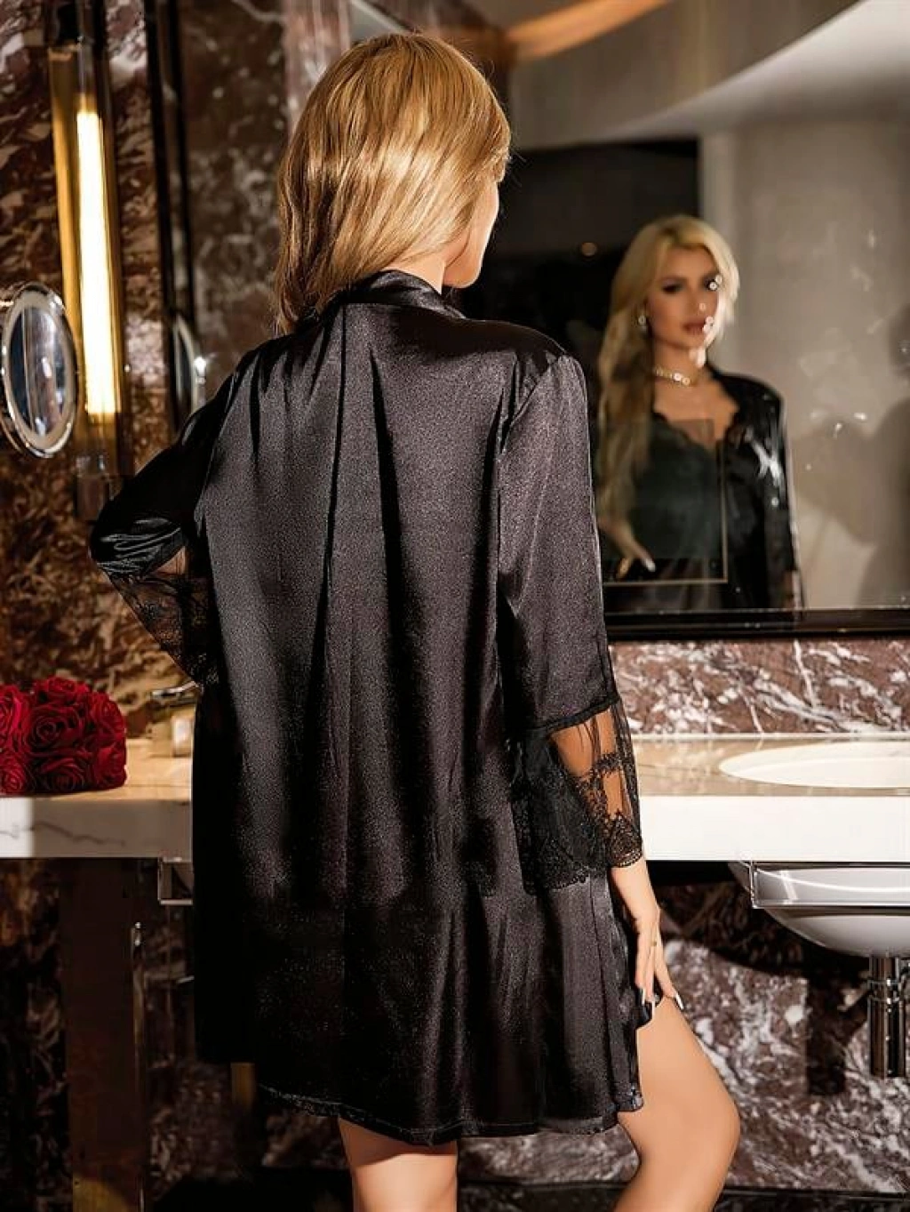 Özel Tasarım Dantel İşlemeli Şık Göğüs Dekolteli Sabahlıklı 2'li Siyah Saten Gecelik Takımı, ipeksi saten dokusu ve derin siyah rengiyle gecelere sofistike ve etkileyici bir şıklık katar. Göğüs dekoltesi feminen bir çekicilik sunarken, zarif dantel işlemeler tasarıma lüks bir dokunuş kazandırır.