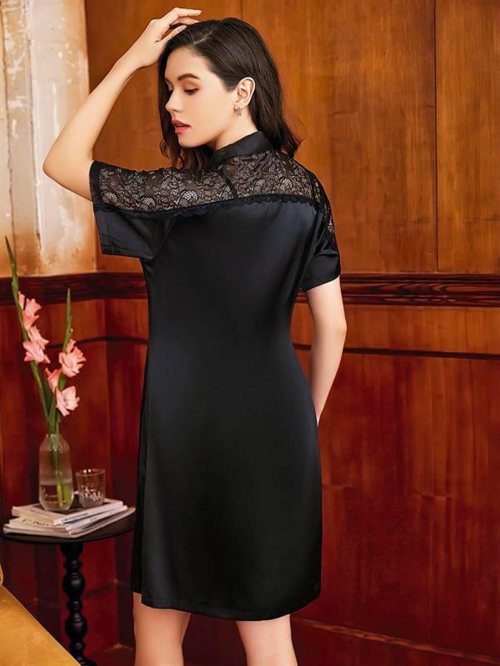 Özel Tasarım Dantel İşlemeli Şık Göğüs Dekolteli Yırtmaçlı Sabahlıklı 2'li Siyah Saten Gecelik Takımı, ipeksi saten dokusu ve asil siyah rengiyle gecelere cesur ve sofistike bir şıklık katar. Göğüs kısmındaki zarif dantel işlemeler feminen bir çekicilik sunarken, yırtmaç detayı tasarıma etkileyici ve iddialı bir hava kazandırır.