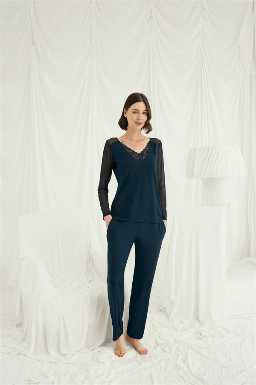 Üst: Gece mavisi renklidir, V yakalıdır, yakası dantellidir, uzun kolludur, kolları tüllüdür, sırt dekoltelidir, Örme kumaştır.