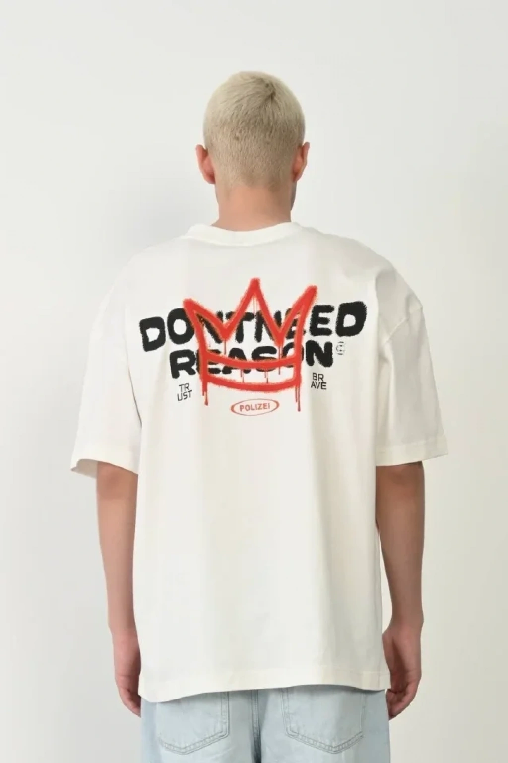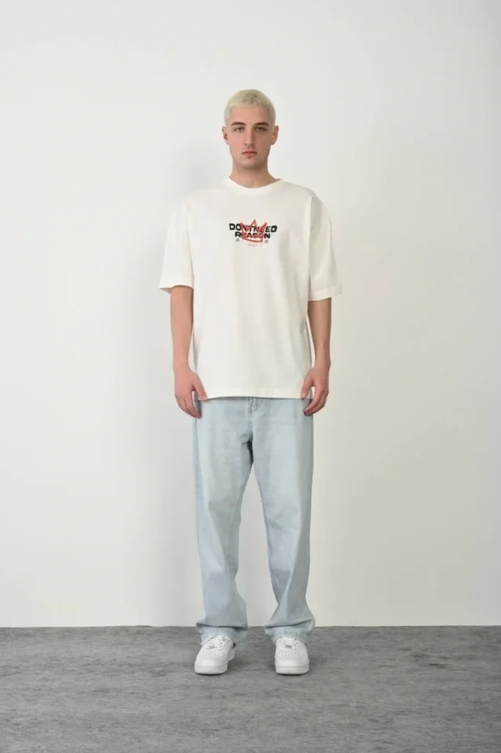 Unisex Bisiklet Yaka Baskılı Oversize Thirt Beyaz
